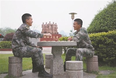 班长李嘉福(右)与战士一边下棋一边谈心,气氛非常融洽。骆瑶摄