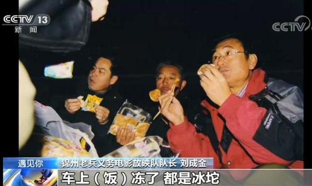 锦州老兵义务电影放映队队长 刘成金:我们当时成立(放映队)的时候约法三章,不怕上山下乡,不吃老百姓一口饭,不拿老百姓一分钱。放电影的时候我们都带盒饭,(那时候盒饭)刚时兴,说吃个盒饭不挺好吗,就把冬天这个时间给忘了,车上冻的都是冰坨。
