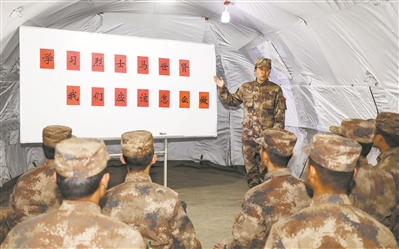 战术训练中,班长王文涛带领班组顶着寒风在训练场上摔打磨砺。王文涛说:“朝鲜战场上,志愿军先烈爬冰卧雪,以顽强意志打出赫赫军威。我们也要像他们一样,成为能打敢打、勇战善战的尖刀利刃!”