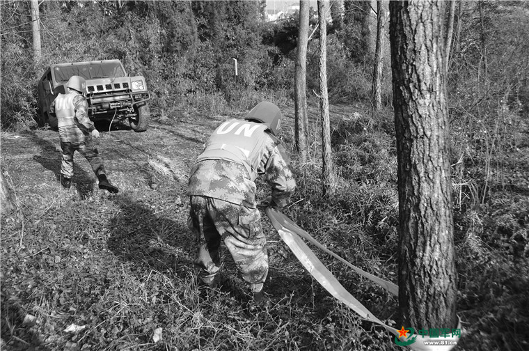 “嗒嗒嗒……”突然,枪声四起。随着印有醒目“UN”字样的白色勇士车驶入泥泞崎岖的险难路段,一伙蒙面“武装分子”从道路两侧的灌木丛中鱼贯而出。正在执行巡逻任务的“军事观察员”被赶下车。