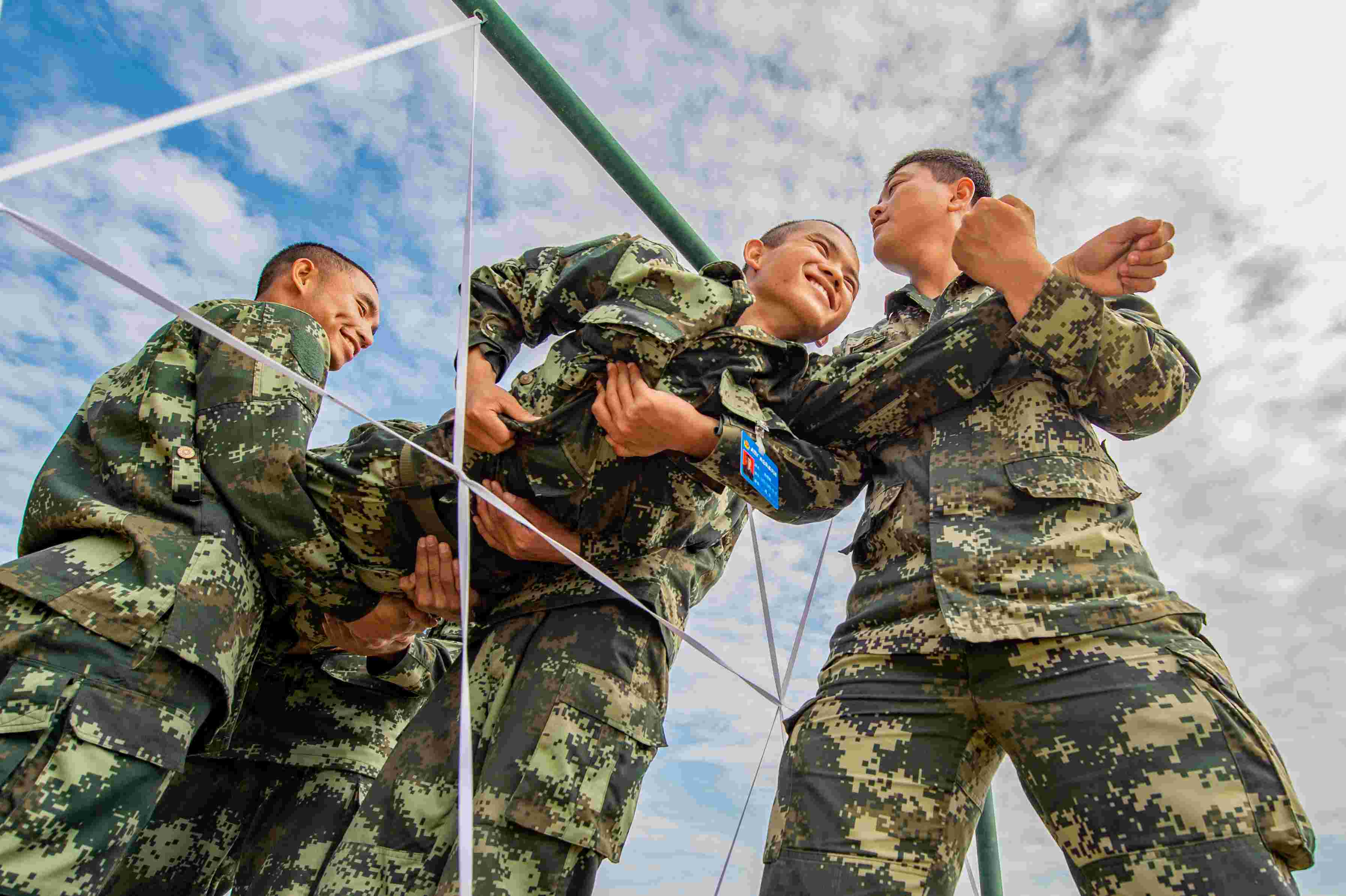 图为新兵正在进行“穿越电网”心理行为训练。