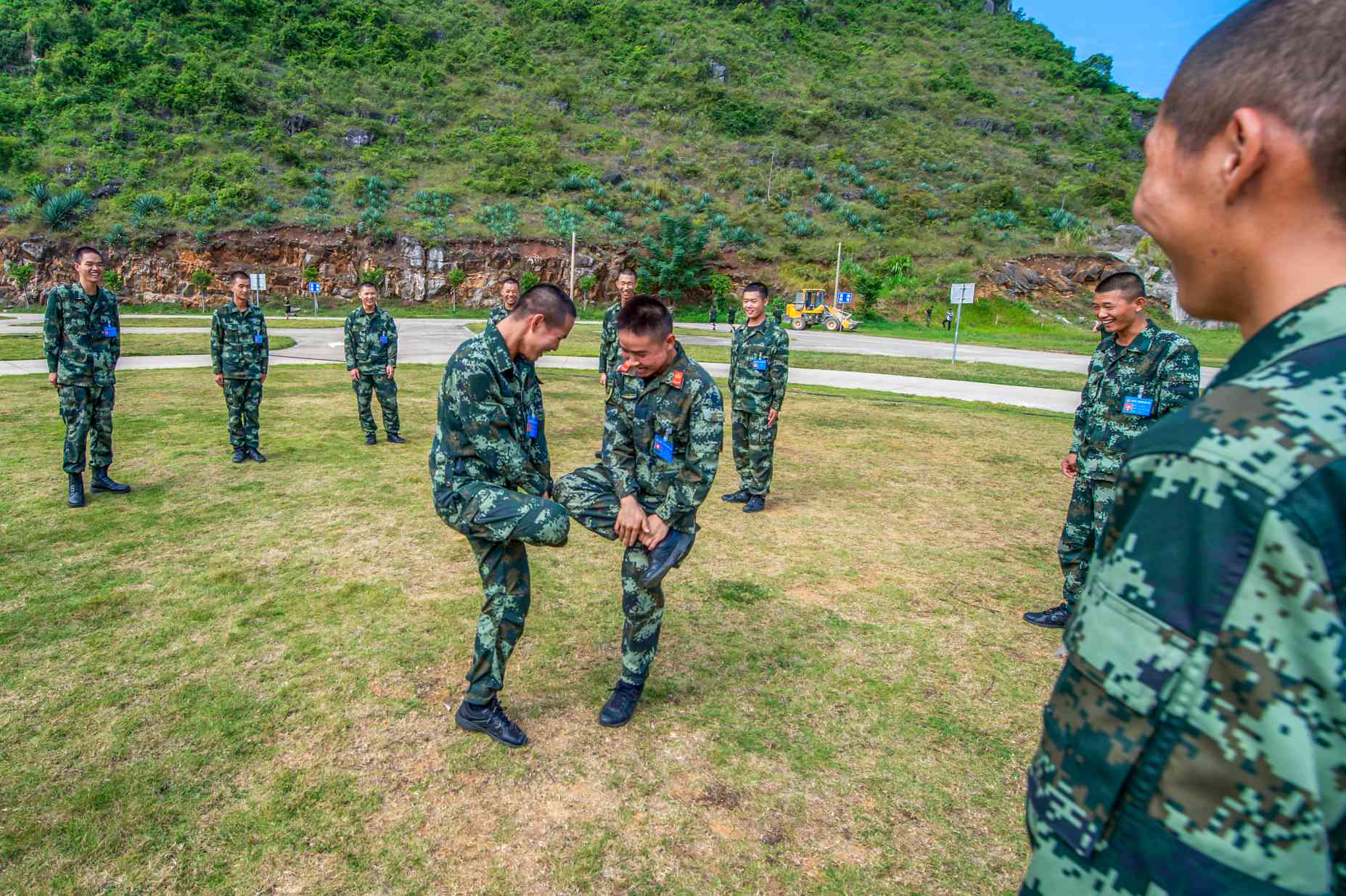 图为一名新兵与一名班长正在进行“斗鸡”游戏。