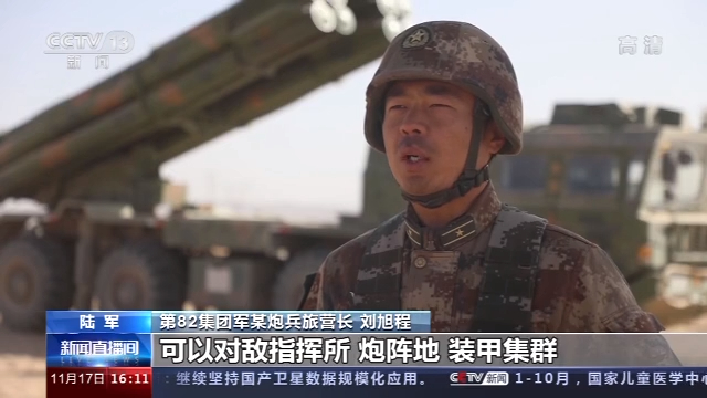 第82集团军某炮兵旅营长 刘旭程:远程火箭炮威力大、射程远、覆盖面广,可以对敌指挥所、炮阵地、装甲集群、弹药库等多种不同距离、不同性质的目标,同时进行精确的火力打击。