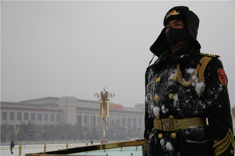 此刻,他和其余221名身着陆海空三军礼服的国旗护卫兵正站在人民英雄纪念碑基座北侧平台上,面向天安门城楼,持枪立正。