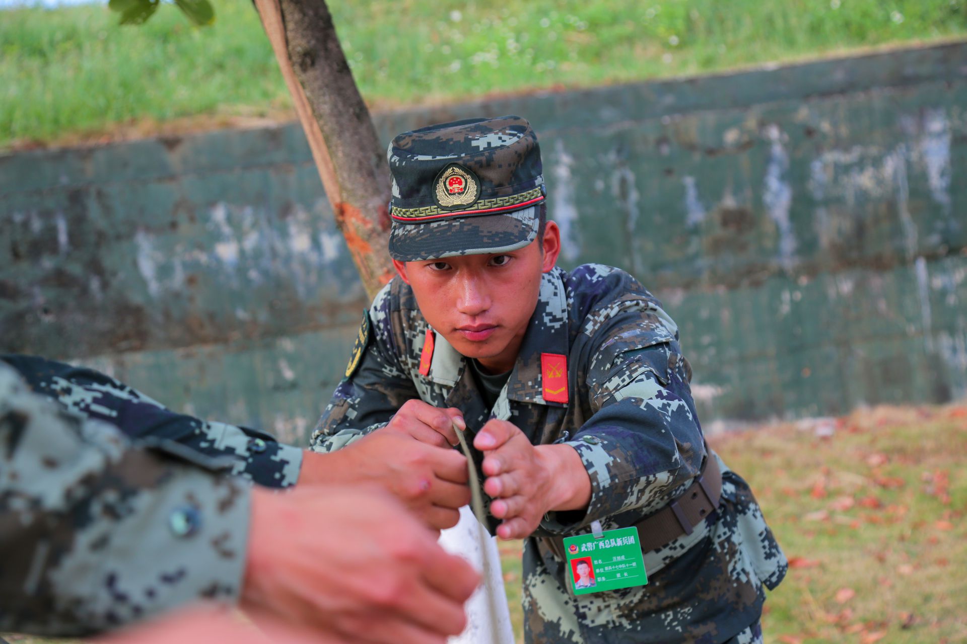“夏良华,你领会动作要领很快,但还需进一步加强练习!申天豪,你刚才的动作是错误动作,来,我对你进行单个教练!”在武警广西总队新兵团柳州承训点训练场,一位新训班长铿锵的口令声此起彼伏。虽然暮色已晚,他仍然不厌其烦一遍遍重复地纠正新兵的擒敌动作。