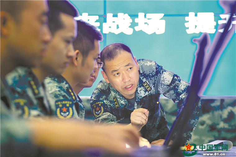 中部战区空军雷达某旅数据分析师刘志成(右一)指导战勤参谋完成作战课题研究。 刘 川摄