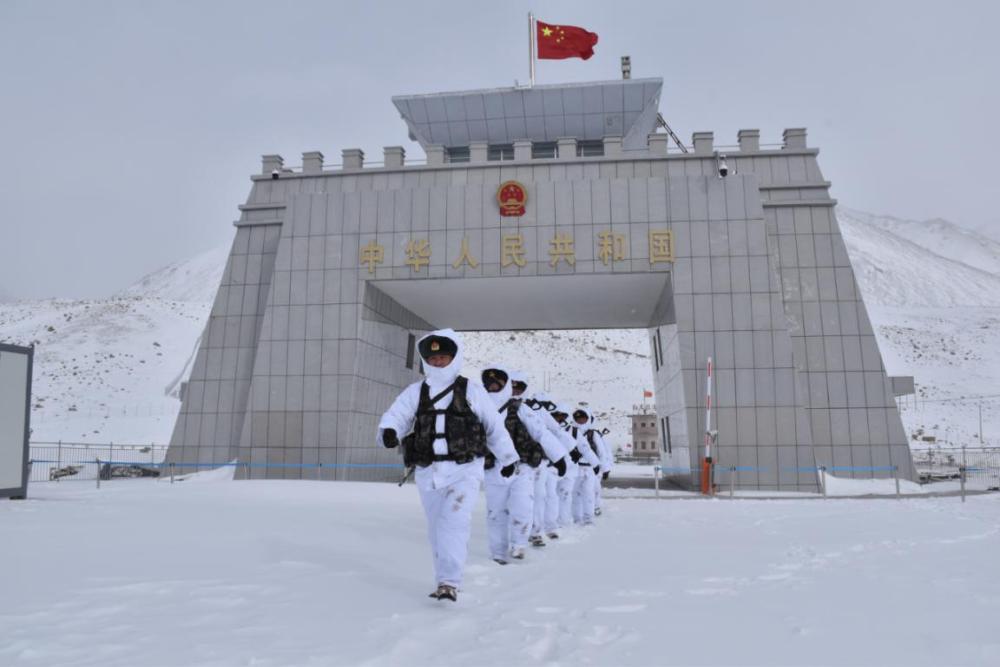 红其拉甫边防连即将退役的老兵在国门前执行巡逻任务