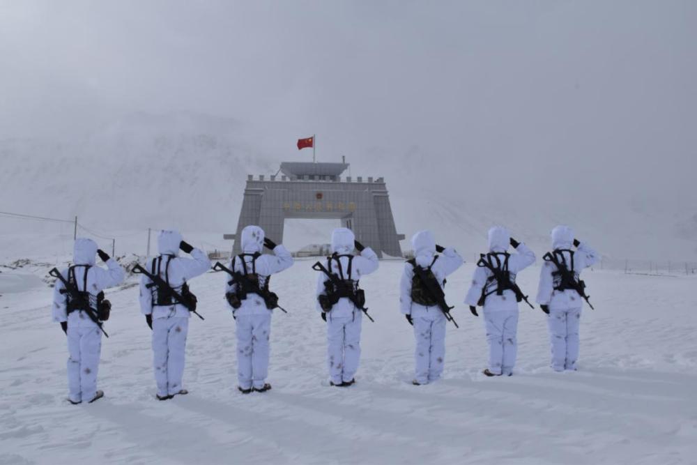 红其拉甫边防连即将退役的老兵面向国门敬礼告别