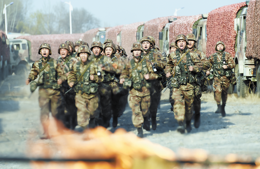 志愿军战士们匍匐在雪地里,保持着战斗冲锋的姿态,身上落满积雪——在“长津湖战役”的实景前,中部战区空军某部一连政治指导员王海杰正在为战士们讲解这场战役背后的故事。