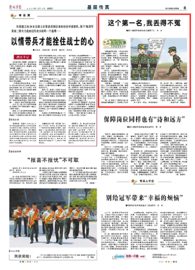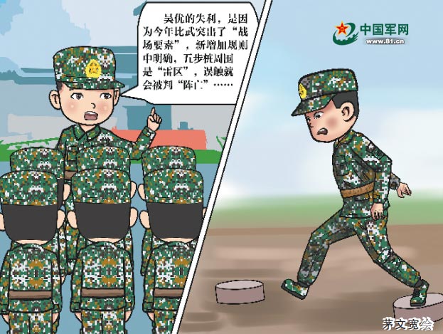 “这次比武,吴优同志表现很好,在场上展现出了扎实的训练成果,这点值得表扬。”当天晚点名的时候,连长先是对我进行鼓励,继而一针见血地指明,“吴优的失利,是因为今年比武突出了‘战场要素’,新增加规则中明确,五步桩周围是‘雷区’,误触就会被判‘阵亡’……”