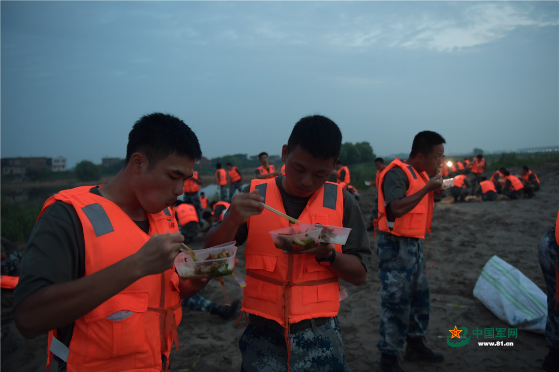 大堤上,官兵抓紧时间吃饭。余红春 摄