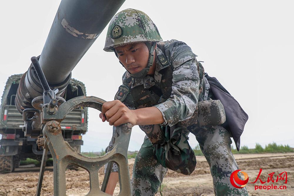 官兵在开启炮管固定器
