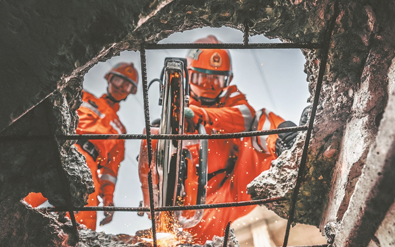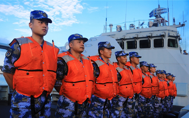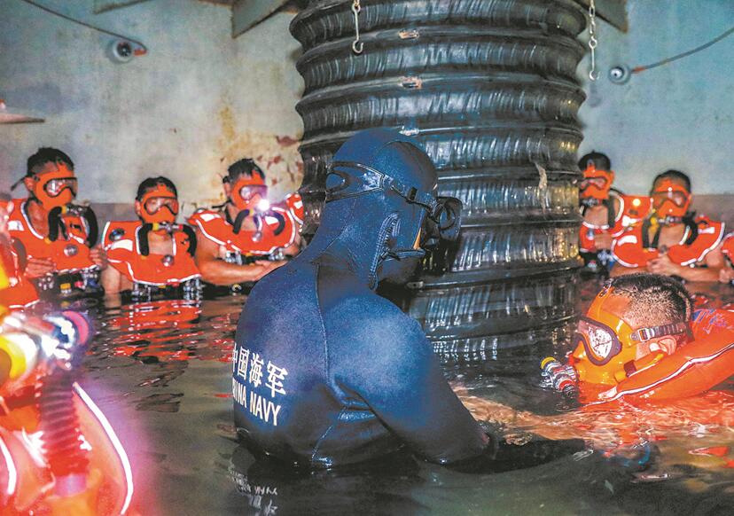 战斗警报传来,某潜艇遭“敌”袭扰,险情接踵而至。该艇立即启动一级部署,实施脱险作业。指挥员沉着指挥,艇员迅速穿戴脱险装具。在潜水员协助下,艇员依次沿着救生通道上浮至海面。