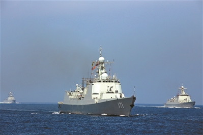 “中华神盾”海口舰驶向深蓝。本报记者 张雷摄 |