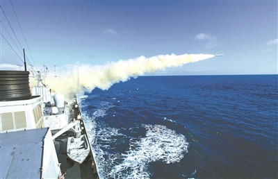 海口舰发射导弹。周启青摄 |