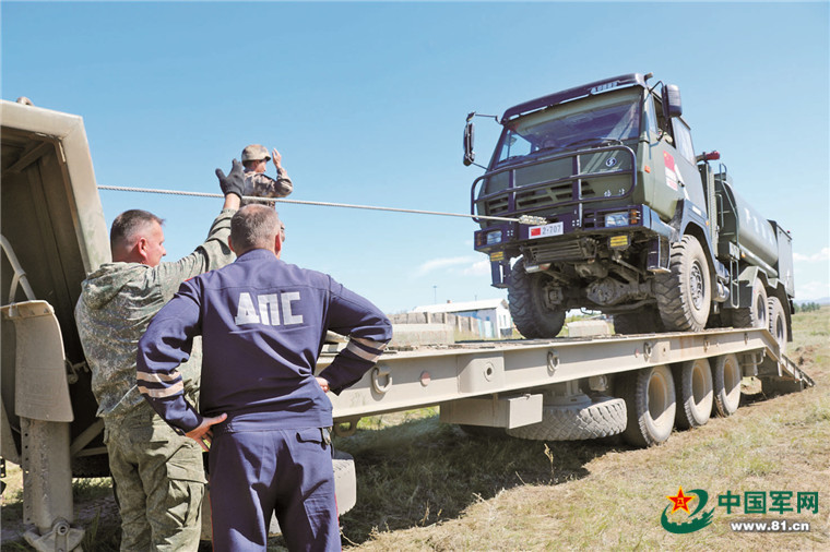 俄军2名士兵20分钟内就把10吨重的油车拖到车上。邓庆颖摄