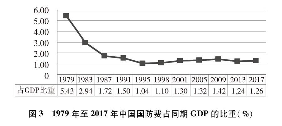 改革开放以来,中国国防开支经历了从维持性投入到适度增长的发展历程,总体保持与国家经济和财政支出同步适度协调增长。国防费占国内生产总值(GDP)比重从1979年最高的5.43%下降到2017年的1.26%,近30年一直保持在2%以内。1979年国防费占国家财政支出比重为17.37%,2017年为5.14%,下降超过12个百分点,总体下降趋势明显。