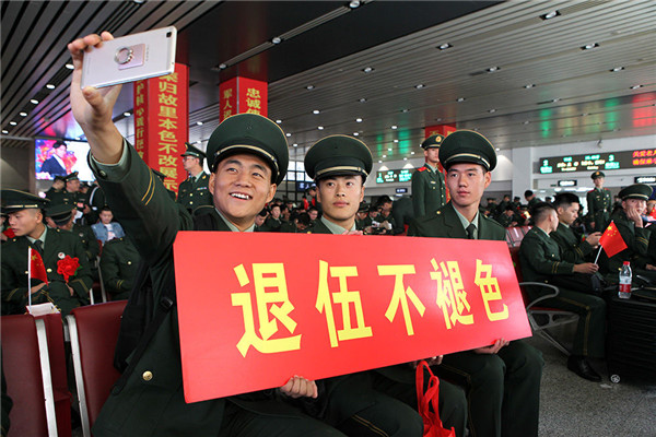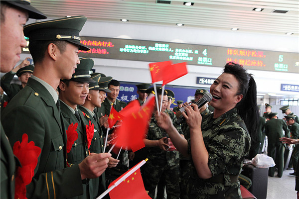 8日,武警北京总队送老兵文艺演出在北京西站军人候车大厅上演。总队司令员、政委和机关部门、支队领导,总队文艺轻骑队队员,早早来到这里,为退伍老兵送行,向退伍老兵致敬。