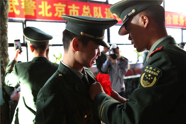 班长为退伍老兵佩戴光荣花。漆锡 摄