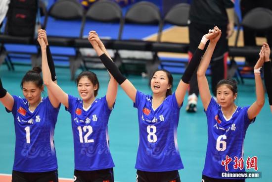 10月20日,第七届世界军人运动会女排小组赛第三轮,中国八一女排3:0(25-11/25-5/25-19)战胜加拿大女排。图为中国八一女排获胜后,袁心玥(8号)、李盈莹(12号)和高意(6号)等队员向观众致谢。中新社记者 侯宇 摄