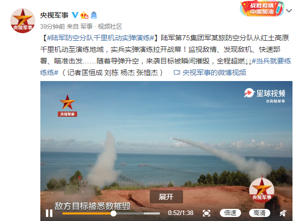 陆军第75集团军某旅防空分队从红土高原千里机动至演练地域,实兵实弹演练拉开战幕!监视敌情、发现敌机、快速部署、瞄准击发……随着导弹升空,来袭目标被瞬间摧毁,全程超燃↓↓(记者匡恒成 刘栋 杨杰 张愔杰)