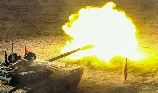 中方参演官兵驾驶俄军坦克对“敌”开火。