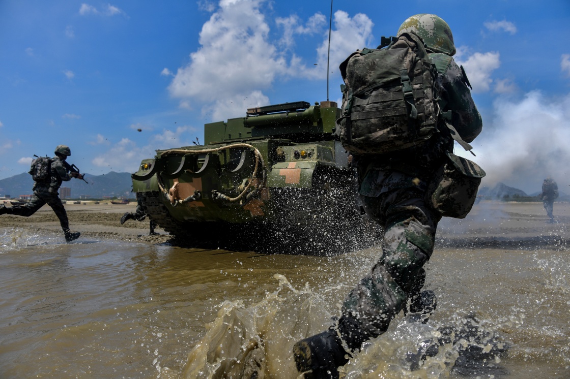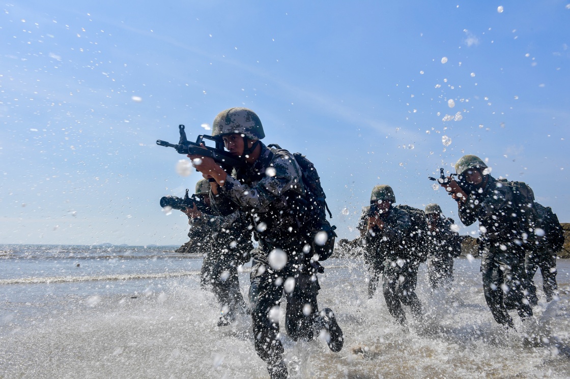 东部战区陆军第73集团军某旅红四连官兵进行抢滩登陆训练(7月28日摄)。新华社发(刘志勇 摄)