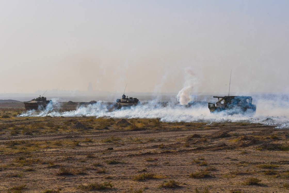 东部战区陆军第73集团军某旅红四连官兵在大漠戈壁参加红蓝对抗演练(10月9日摄)。新华社发(刘志勇 摄)