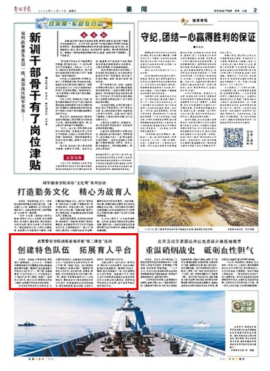 训练过程中,他们结合“强军风采”群众性文化活动要求,安排合唱队教唱红色经典歌曲;“醒狮团”将武术、舞蹈、音乐表演融为一体,并在重要纪念日进行表演。每逢重大节日,特色文化队伍积极参加基地及驻地多种形式的文化演出和比赛活动,逐渐形成军校特色文化品牌,成为促进军地交流的良好平台。