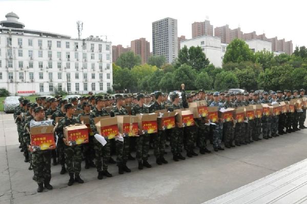 近日,河南省漯河市召陵区人武部在市民兵训练基地为新兵举行被装精准发放仪式,近200名新兵按照军种整齐列队,依次上前领取被装箱。