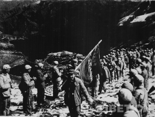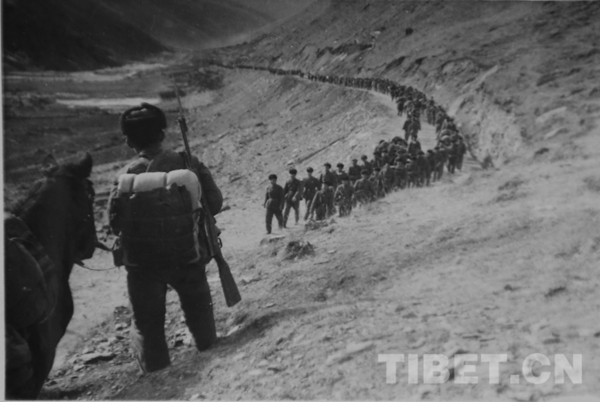 图片为西藏文工团老照片:第三文化工作队向乃堆拉的山口前进,王勉之是旗手。 图片由王勉之提供