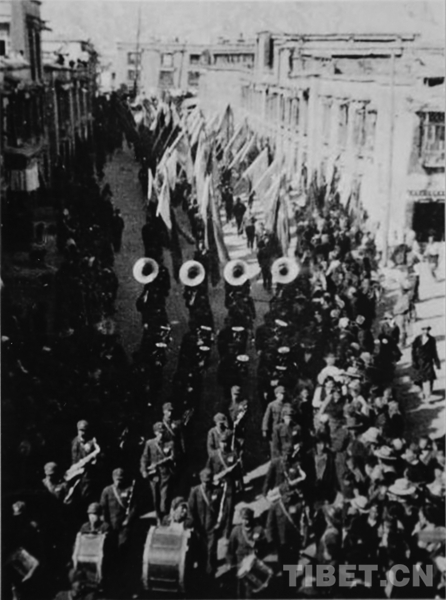 图片为西藏文工团老照片:十八军到达拉萨。文工团、军乐队参加入城式,行进在八廓街。图片由王勉之提供