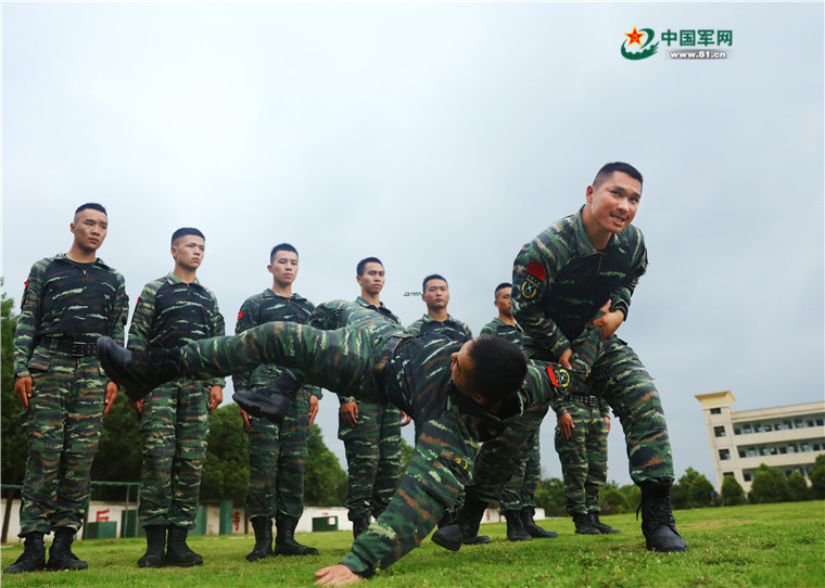 为使战友们更快更好掌握新大纲新增训练科目,王喜作为班长总是以身作则,率先垂范。图为王喜亲自示范摔擒动作。(杨宁摄)