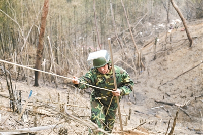 面对地雷这个莫测的“敌人”,扫雷官兵手中最常用的武器是探雷器、探雷针。然而,探雷器能探测的面积十分有限,人工搜排是必不可少的作业手段。