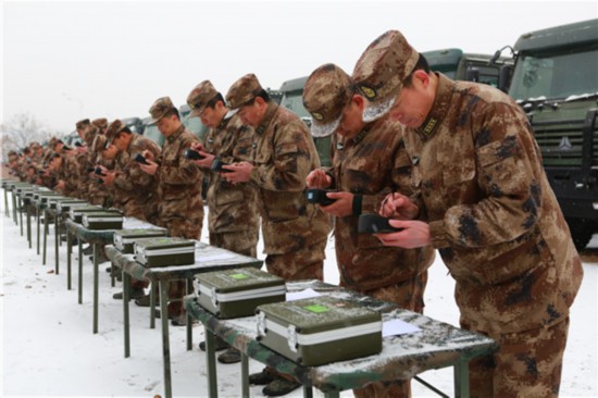 图为官兵冒雪进行通信装备操作比武考核。胡善雨 摄