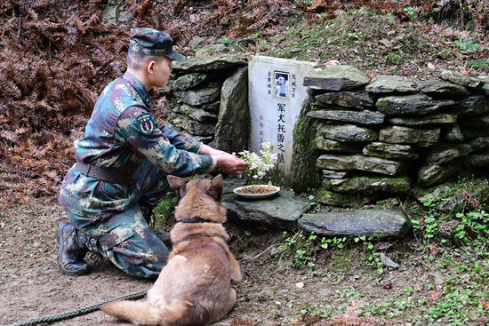 清明前夕,火箭军某部中士张健牵着军犬“火焰”前去看望昔日的无言战友——军犬“托雷”。张健带着犬粮,与“火焰”坐在“托雷”墓前默默哀思。2013年5月,军犬“托雷”长眠在巡山道上,它的忠诚足迹被一代又一代“后来者”延续着。(于迪超 许蒙蒙 郁范龙文并摄)