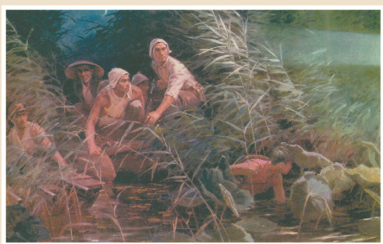 该画描绘了游击队潜伏在芦苇丛中准备出击的场景,主体人物造型严谨、形象生动,将游击队员的神态描绘得淋漓尽致,画面具有较强的感染力。