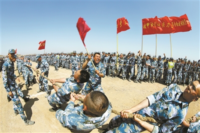 近日,海军陆战队某旅在驻训点组织拔河比赛,经过几轮PK,炮兵营和侦察营的两支参赛队伍走到了决赛场,双方较起了劲儿。瞧!炮兵营排长吴涛手握指挥旗,大声呐喊着,队员们拼尽全力,一时难分高下。