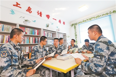7月上旬,空军某部新闻报道员申卫红(图中左三)等前往北部战区空军某旅“红色前哨雷达站”采访前,得知该雷达站正在开展“上岛请带一本书”活动,他们精心挑选、自费购买了一些书籍,经过4个多小时的客船颠簸,将其送到官兵手中,并与大家现场交流读书心得。