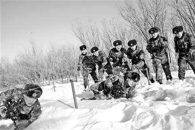 11月下旬,新疆军区某边防团加曼奇边防连在雪地组织战术基础动作训练,连队党支部书记詹克钧与士官党员带头通过铁丝网。 张 健摄