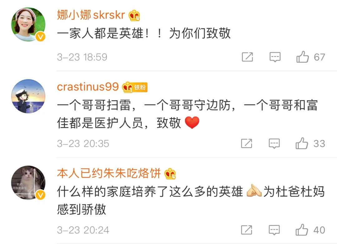大儿子杜富国是“扫雷英雄”,在执行边境任务中九死一生;最小的儿子杜富强在最艰苦的西藏高原戍边卫国;新冠疫情发生时,二女儿杜富佳主动请缨,奔赴武汉抗疫;三儿子杜富民也坚守在当地医院的ICU病房里……