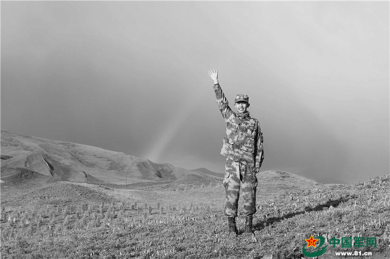 一场冰雹过后,一道亮丽的彩虹悬挂天上。张哲超从帐篷里出来,朝着彩虹的方向跑去。他把手机递给战友,留下一张珍贵的“彩虹合影”。