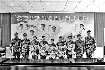 灌云县人武部邀请王仕花与援鄂民兵护士为县民兵应急分队队员授课。参与组织此次活动的文职人员李俊达(右一)跟随分队一同感悟楷模精神。