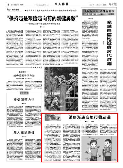 做到循序渐进,应克服急功近利的思想。哲学家培根说:“思想决定行为,行为决定习惯。”思想是行动的先导,新战士初到军营,不要总想着寻找捷径,“一口吃成个胖子”,要养成“不驰于空想,不骛于虚声”的作风,做事不急于求成。军旅人生路是一场比拼耐力的马拉松,唯有耐得住寂寞,稳扎稳打,才能最终有所成就。为学好专业知识,王忠心翻烂了教材,为啃下电路图这块“硬骨头”,他把十几米长的图纸化整为零,反复默画背记,仅一个电缆插拔动作就练习了上千次,终于练成过硬本领,成为大家眼中的“兵王”。新战士应懂得水滴石穿、磨杵成针的道理,注重日复一日的积累,终能实现从量变到质变的飞跃。