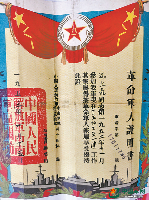 沈上龙的《革命军人证明书》。雷晓宇摄