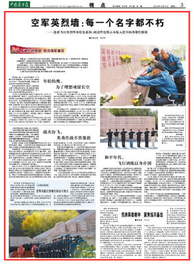 坐落于北京北郊的中国航空博物馆里,有一面空军英烈墙。那上面有1776个鲜红的名字,深深镌刻在花岗岩墙体上。正如一位著名作家所说:“那一行行英雄的名字,标定了空军精神的制高点,本身就是最好的壮烈文字。”在那里,英雄不再是一个抽象的符号,而是具体的有思想有情感的生命个体,这是人民空军对历史上每位流血牺牲英雄的尊重。