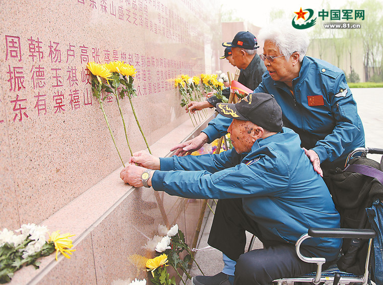每年清明节或空军成立纪念日前后,从祖国四面八方聚集到空军英雄纪念墙前的人特别多。90多岁高龄的战斗英雄王天保在英烈墙前向战友敬献鲜花。