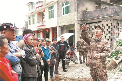 时任恩施市人武部部长董高(右一)向乡亲们讲解果树栽种技术。