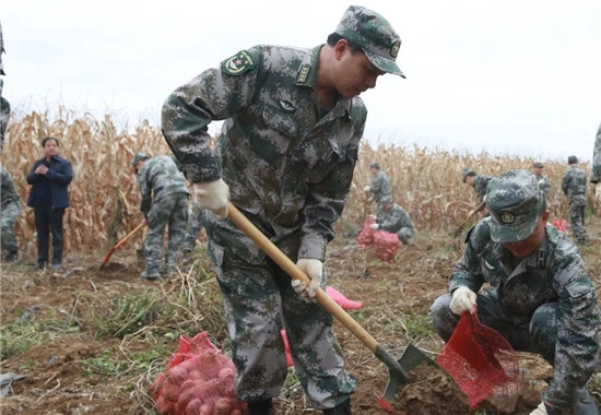 政治工作部领导与机关干部一起帮助村民捡收土豆
