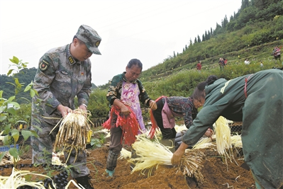 安顺军分区政治工作处官兵帮助韭黄村村民收割韭黄。叶 高摄